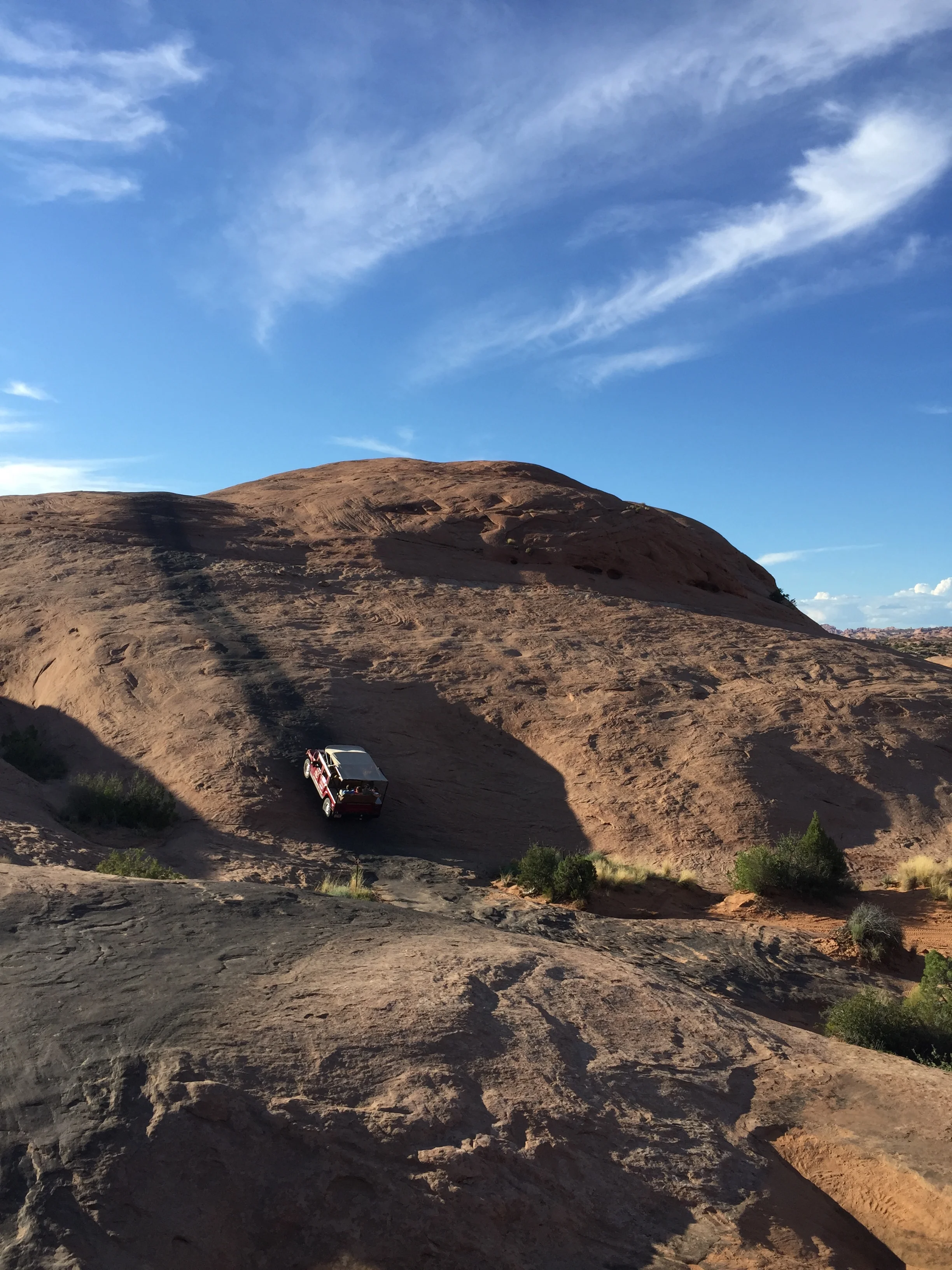 Wanting an even more personal experience with the landscape, we signed ourselves up for a sunset hummer trip. We also opted for a room at the pet friendly Big Horn(y) Lodge to give Roux a chance to cool down. The red hummer showed up and we picked seats in the back for the bumpiest ride possible. The “machine”, as they call it, took us to Slick Rock, a 4x4 park with killer roads and crazy views. The park provided 80 degree inclines and declines, plus views of the rivers and canyons. We popped out for some extra special photo ops with Alasaurus foot prints (Utah’s dinosaur) and at echo ridge where we were instructed to yell into the canyon. When asked for a word or phrase, Erica provide YOLO for the group and the intense echos back reminded us that we were on a trip of a lifetime. After taking in the beautiful sunset, we drove the windy trails back in the dark and said goodbye to our skilled driver, DeVon. A final night cap at the Moab Brewery prepped us for a good nights sleep, we tucked ourselves in for one last day in Moab.